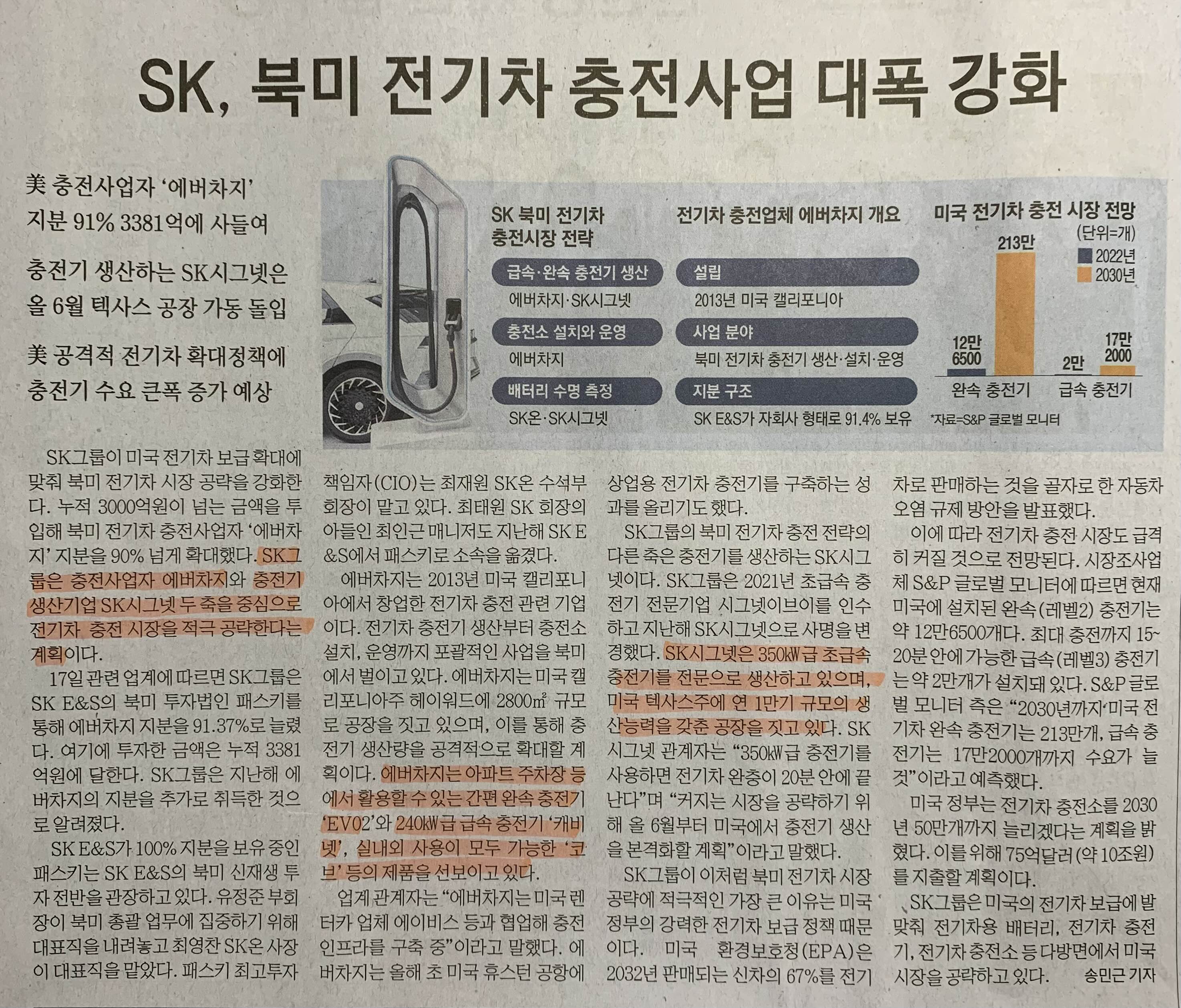 SK그룹이 미국 전기차 보급 확대에 맞춰 북미 전기차 시장 공략을 강화하고 있다. SK그룹은 충전 사업자 에버차지와 충전기 생산업체 SK시그넷 두 축을 중심으로 전기차 충전 시장을 적극 공략할 계획이다.